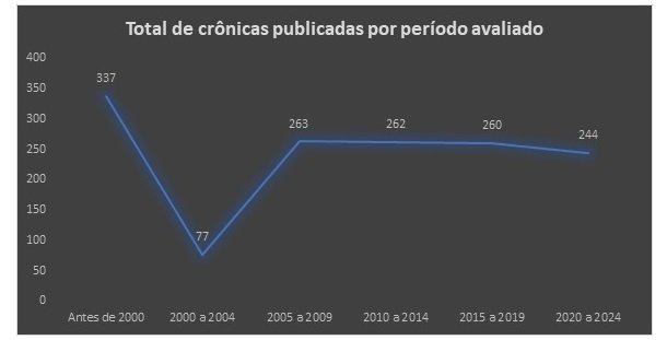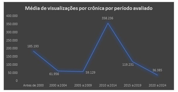 De 2015 a 2020, o ritmo seguiu forte, mas com um leve declínio: 260 crônicas, 6.200.564 visualizações e uma média de 119.231 leituras por crônica. A mais lida teve 113.735 visualizações, um desempenho respeitável.
